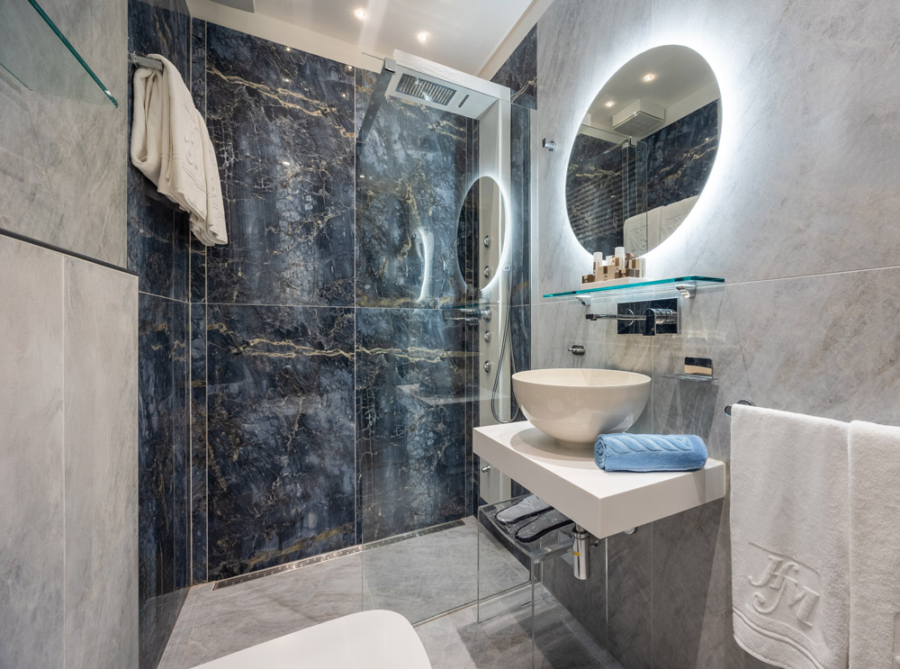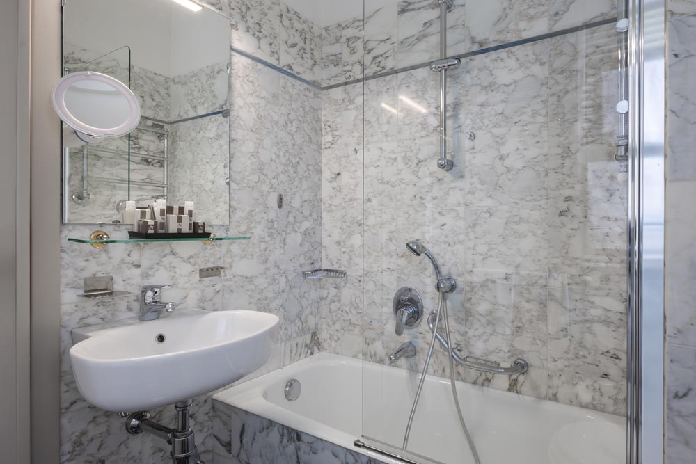 ainsi que d'une salle de bains privée avec baignoire ou douche en marbre précieux de Carrare.