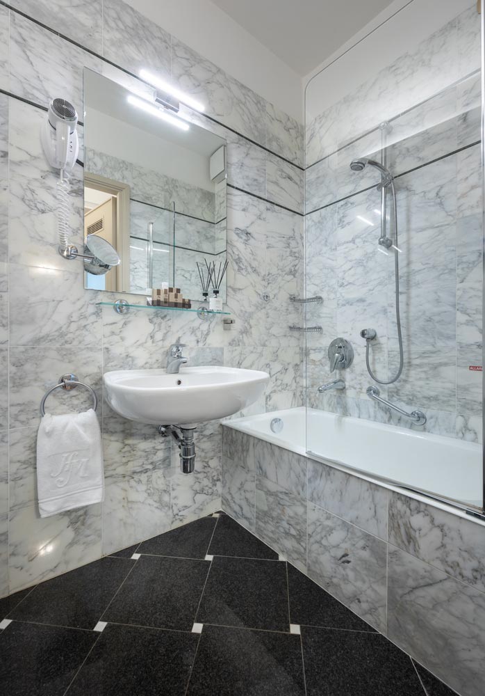 Mesure 8 m2. Meubles en tons de creme et salle de bain en marbre de Carrare ou en porcelaine claire.