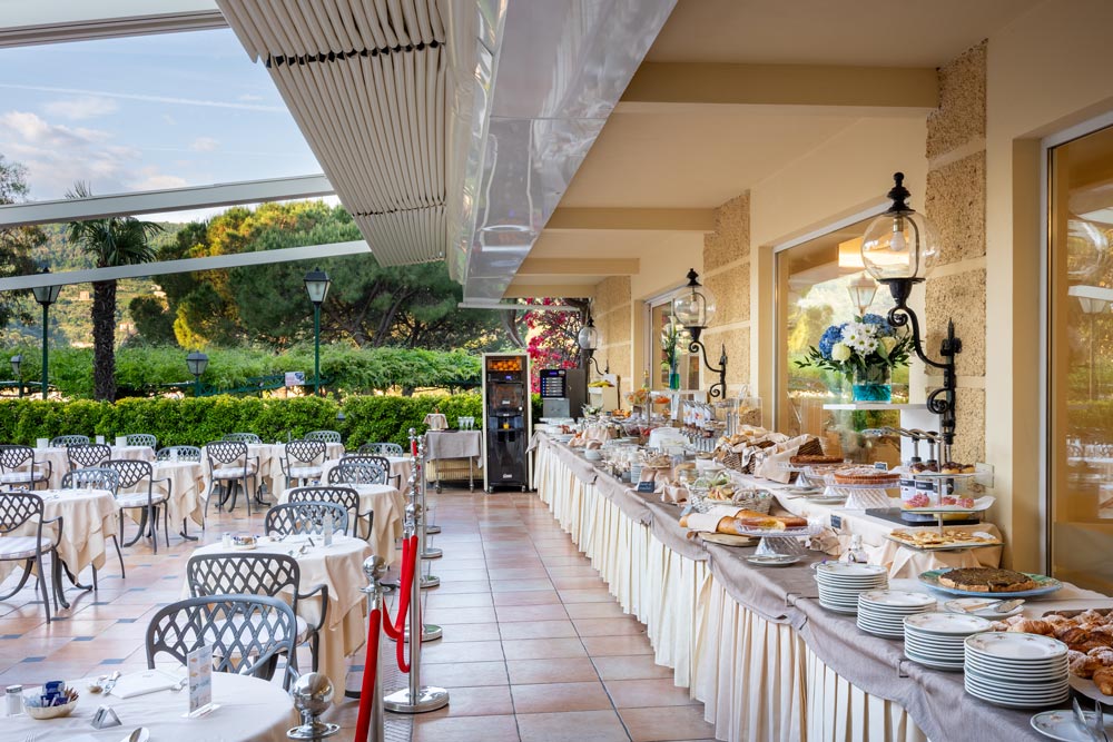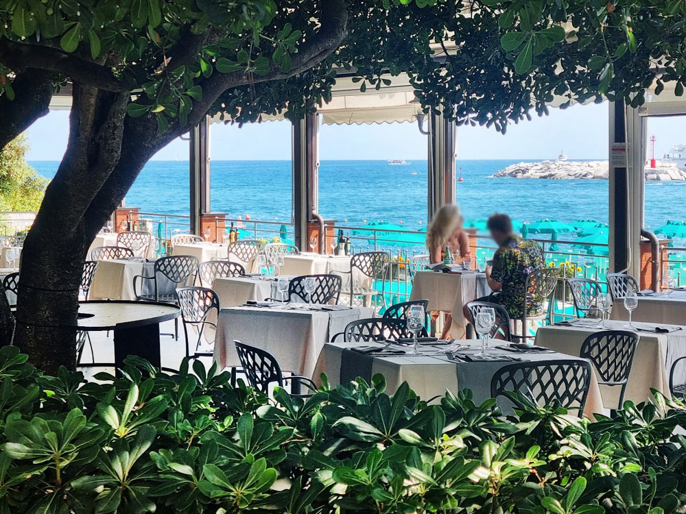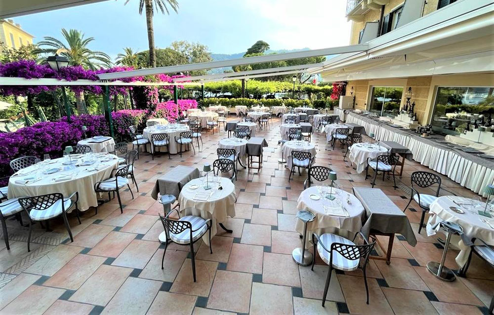 a terrasse d'été surplombant le golfe, où se trouve le restaurant Beach Club, vous pourrez déjeuner en admirant Santa Margherita Ligure, le port avec les yachts et les bateaux de pêche, les collines derrière, toute la côte jusqu'à Portofino qui donne au lieu un ambiance romantique et suggestive.